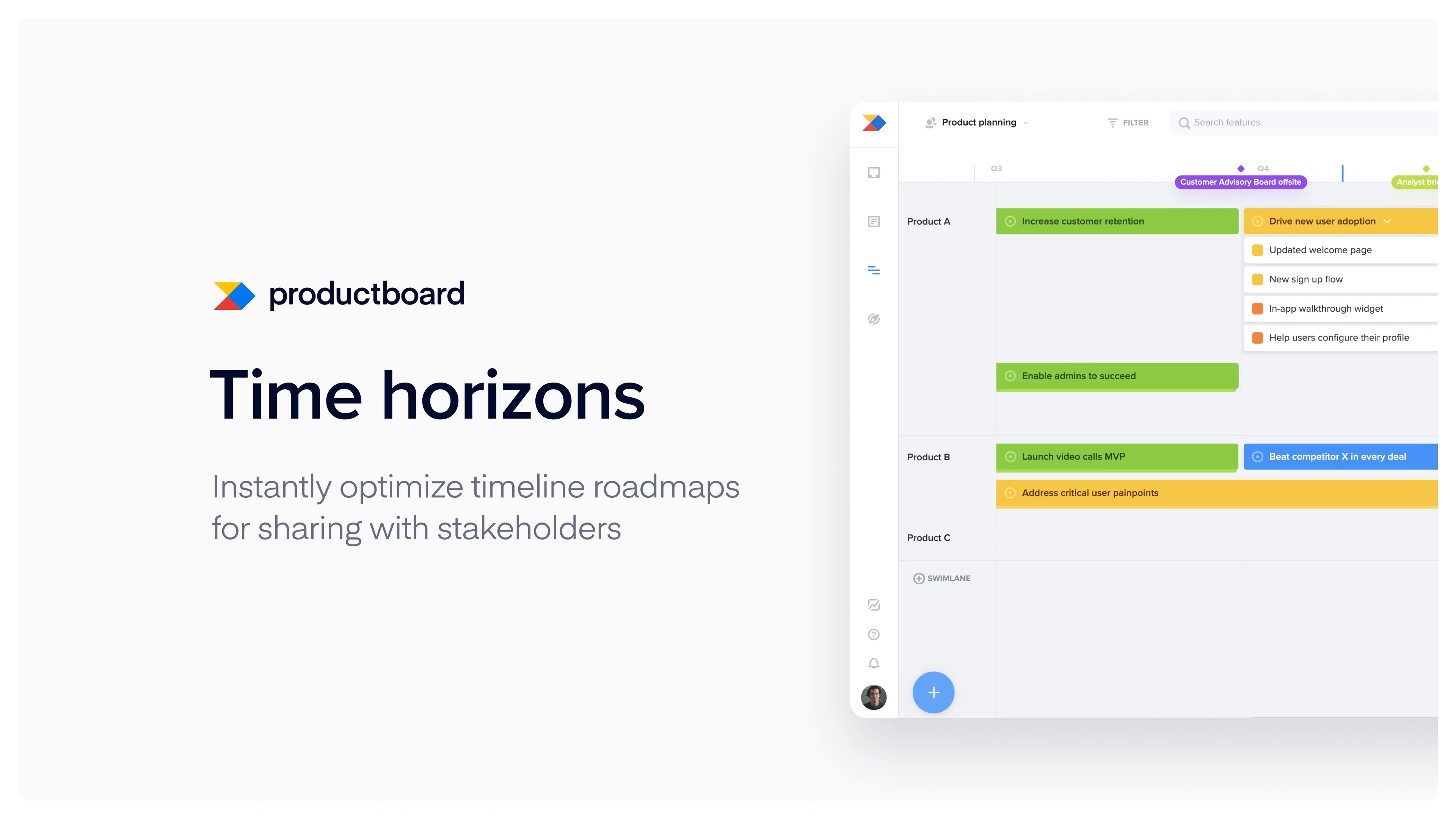 And yet, date-based roadmaps are entirely useful for modern Agile product teams! They help your product team carry out internal planning toward upcoming date-based milestones. They can help you see exactly what teams are working on, and identify cross-team dependencies early to avoid costly delays. And in the short run, they provide a more detailed view of what’s getting delivered when, which helps for coordinating launches and preparing customer-facing teams for product updates. You can even abstract the specific dates on your timeline roadmaps to make them suitable for sharing with all your stakeholders! Later we’ll take a look at how Productboard’s time horizons functionality can help you do just that.