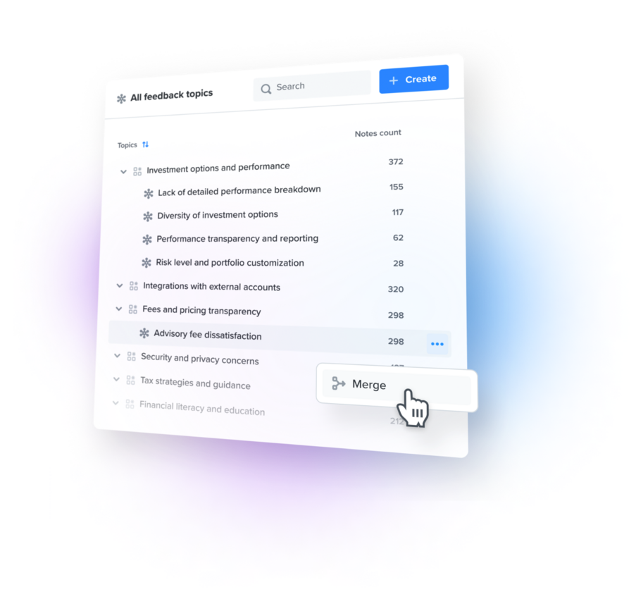 Curate a hierarchy of feedback topics, both AI-generated and maker-defined, to continuously refine feedback categorization to best reflect your product and how customers express their needs.