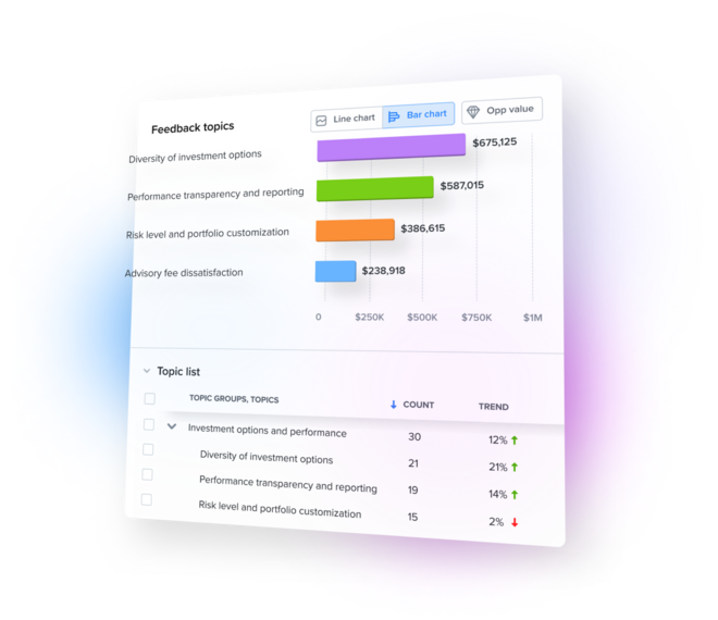 Explore interactive dashboards and drill into feedback topics to uncover underlying customer needs.