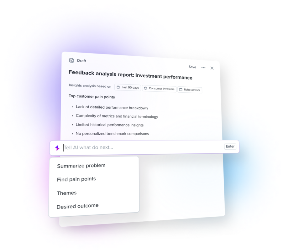 Centralize feedback from many integrated sources and sit back as AI distills recurring topics.